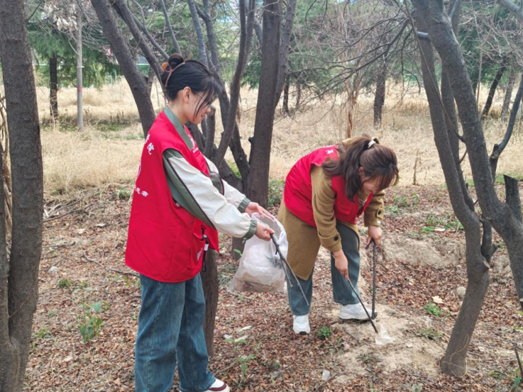 活动当天,志愿者们身着红色马甲,手持垃圾夹、环保袋等工具,分组深入树林区域,对落叶堆积区、步道两侧及隐蔽角落的塑料袋、烟头、废弃包装等垃圾进行“地毯式”清理。还原自然风貌。弯腰捡拾的不仅是垃圾,更是对自然的敬畏。守护每一寸绿色,是医学生守护生命健康的另一种表达。