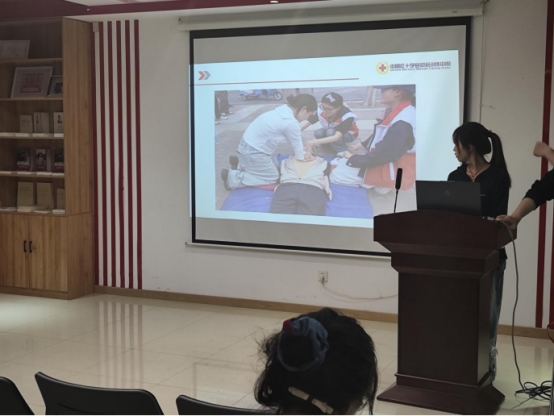 活动中,主讲同学以PPT演示为基础,围绕心肺复苏、创伤处理、异物梗阻急救等核心内容展开详细讲解,结合真实案例剖析应急救护的关键要点与操作规范。“黄金四分钟”“海姆立克法步骤”等实用知识的深入浅出解读,让在场同学深刻认识到应急救护在日常生活中的重要性。