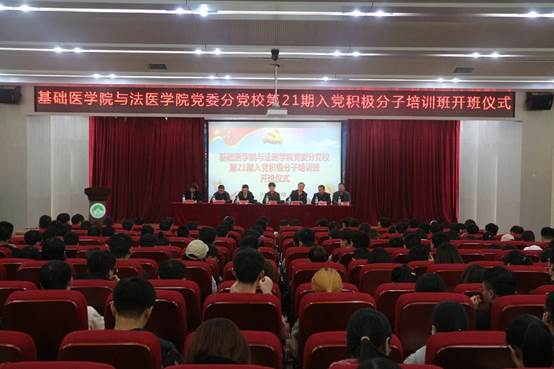 (文/王敬 图/张金龙)为加强对入党积极分子的培养和教育,帮助广大入党积极分子端正入党动机,提高思想觉悟。基础医学院与法医学院党委分党校于10月18日至21日举办基础医学院与法医学院党委分党校第21期入党积极分子培训班暨第12期微党校。学院党委书记、分党校校长王宏玲,党委副书记李照勇、白婕,基础医学院学生办公室主任岳学强,基础医学院团委书记包巍,法医学院党政办公室主任涂飞出席开班仪式,基础医学院与法医学院辅导员以及近300名入党积极分子参加了开班仪式。开班仪式由基础医学院党政办公室主任张博主持。