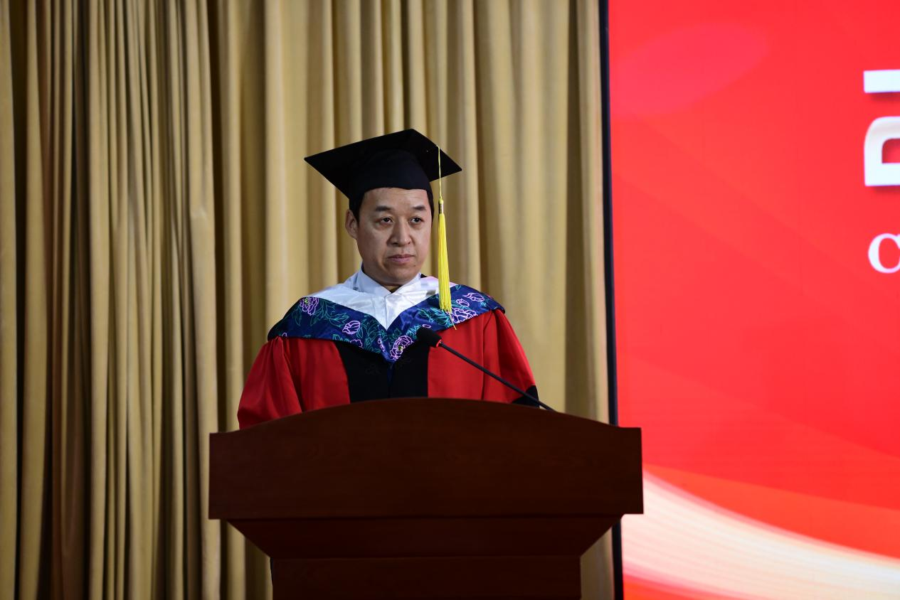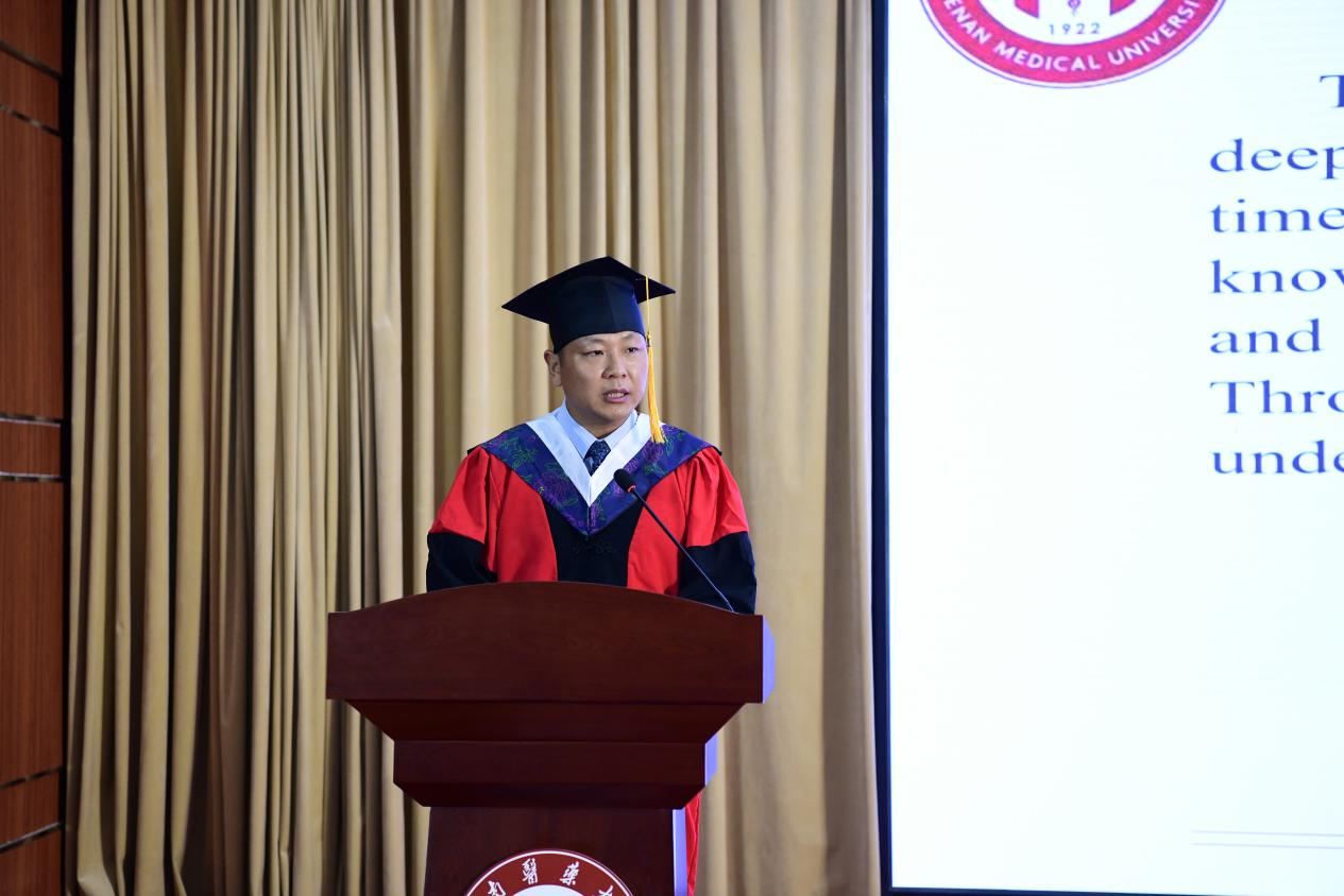 袁磊在致辞中回顾了2025届国际毕业生在校期间的成长点滴和精彩瞬间,并特别提及他们是历史的见证者——2025届国际毕业生亲历并见证了华亿在线体育(中国)官方网站正式更名为河南医药大学这一里程碑时刻,与学校共同迈入了跨越式发展的新阶段。随后,他给予了毕业生三点深切嘱托:一是永葆求知热忱,做终身学习的践行者,紧跟医学发展,精进医术;二是恪守医者初心,做生命健康的守护者,坚守职业道德,以仁心仁术服务患者;三是秉持包容胸怀,做文化互鉴的推动者,以开放心态促进文明交流。最后,他祝愿全体毕业生不负所学、不负时代,在中外交流的广阔舞台上大展宏图,为创造更加美好的世界贡献智慧与担当。