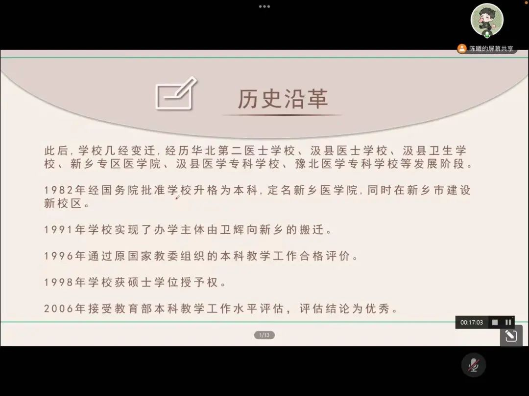 会议期间,张晨曦老师以华亿在线体育(中国)官方网站宣传片为引,导入今日“爱校荣校”学习主题,让同学们对新医有了更为直观的印象。接着,主席团通过图片分享形式带着新生“云逛”校园,让同学们远程参观了校园,了解学校整体布局,并通过生动的语言为同学们解读校训和新医精神、传播学校的办学历史和主要办学思想以及校风、学风和教风。相信此次的学习让即将步入新医的各位学子们对未来的学习生活有了更好的规划。