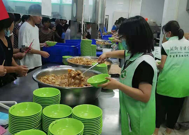 “来,下一位。”志愿者一边维持打饭秩序,一边帮群众盛饭。一勺下去将群众饭碗盛的满满当当。一位又一位……直到所有群众吃饱离开,志愿者们将厨具、餐具等收拾妥当才离开。