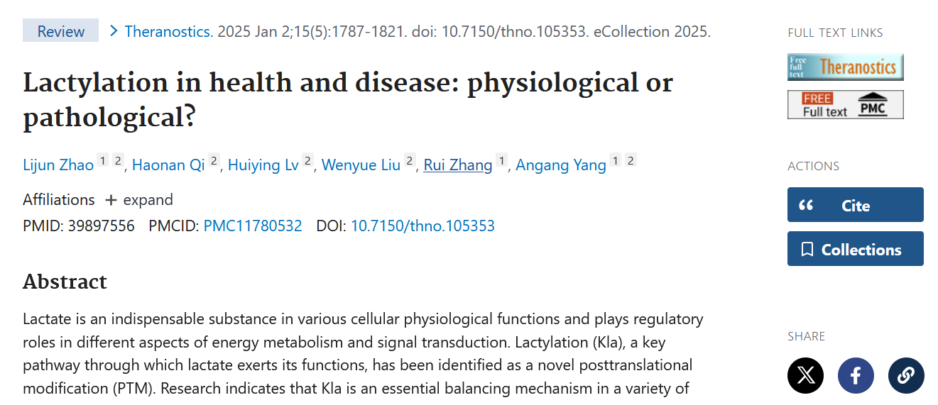 近日,国际著名期刊Theranostics上发表了题为“Lactylation in health and disease: physiological or pathological?”的综述。我校医学技术学院教师赵丽君博士、硕士研究生齐浩男为该论文的并列第一作者,空军军医大学基础医学院杨安钢教授和张瑞教授为共同通讯作者。