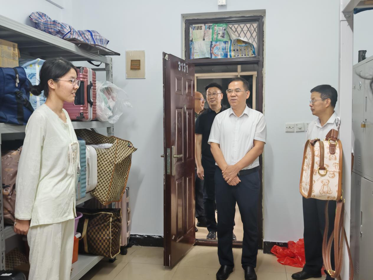 秋雨浸润万象新。9月4日晚,校党委委员、副校长林俊堂带队,教务部、本科生学院等部门负责人及相关学工值班人员,深入新生宿舍楼,看望慰问刚刚入学的2025级新生,与同学们“拉家常、聊近况、话学业”,现场解决他们来校后的各种困惑和问题,为他们送上学校的诚挚欢迎与温暖关怀。