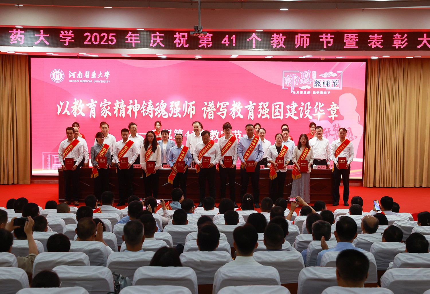 会上宣读了河南医药大学2024-2025学年获得省级以上荣誉称号教师名单、河南医药大学2025年满30年工龄教职工名单、河南医药大学2025年“三育人”先进集体、先进个人名单、河南医药大学新闻宣传工作先进单位和先进工作者名单、河南医药大学2024-2025学年在教学工作方面取得突出贡献的集体及个人名单,在更名大学、获批研究生推免资格高校工作中作出重要贡献的先进集体、先进工作者名单和河南医药大学2024-2025学年在科技工作方面取得突出贡献的人员名单。