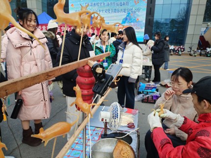 尤为引人注目的是“饴糖凝彩非遗展”——吹糖人体验区。市级非遗项目传承人现场坐镇,展示古老技艺。只见传承人巧手翻飞,吹拉之间,温热的饴糖顷刻化作栩栩如生的生肖动物,引得现场惊叹连连。在传承人的悉心指导下,同学们兴致勃勃地亲身体验,鼓腮吹气、小心翼翼地塑形,零距离感受传统手工艺的精妙绝伦,在指尖的触摸中深刻感悟匠心传承的厚重与珍贵。