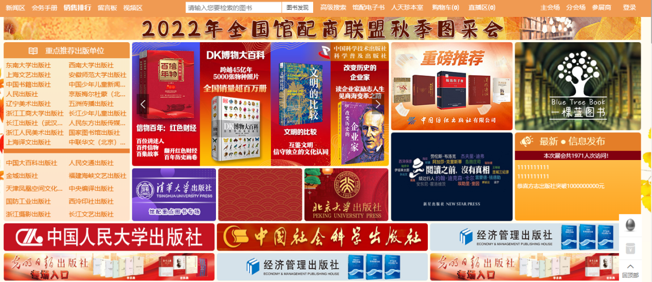 1、主会场:其右上角展示图书采会开幕式领导讲话及平台消息发布。其他板块主要展示重点出版社书目,直接点击出版社名称即可进入选书界面。