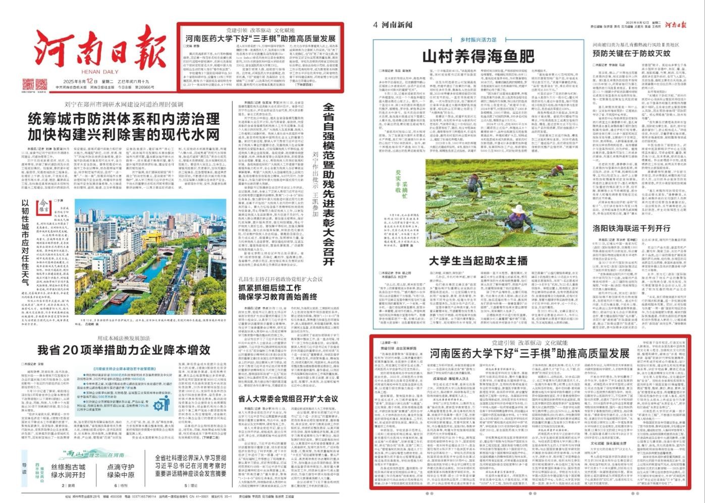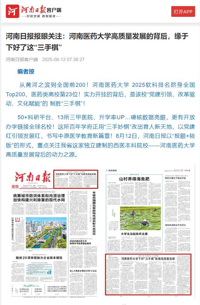 “河南医药大学”承载着厚重的历史,更寄托着无限的希望。我校2025软科排名跻身全国Top200,医药类高校第23位!实力“开挂”的背后,是“党建引领、改革驱动、文化赋能”的制胜“三手棋”。50+科研平台、13所三甲医院、升学率UP,硬核数据亮眼,更有开放办学链接全球名校。学校正用“三手妙棋”改出育人新天地,以党建红引领发展红,书写中原医学教育新篇章!8月12日,《河南日报》以“报眼+转版”的形式,重点关注我校高质量发展背后的动力之源。