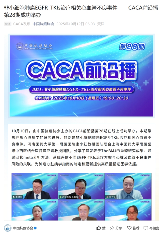 10月10日晚,由中国抗癌协会主办、第一附属医院参与协办的CACA前沿播第28期学术会议在线成功举办。会议聚焦肿瘤心脏病学,重点解读第一附属医院康小红团队发表于国际高水平医学期刊The BMJ的研究成果。本次会议有52个直播平台同步进行,在线观看人数1120.4万,创下该节目开播以来的历史最高纪录。此次会议标志着首项诞生于河南本土的肿瘤学研究成果在全国高水平学术平台上获得认可,为河南省肿瘤学术研究开启了新的篇章。