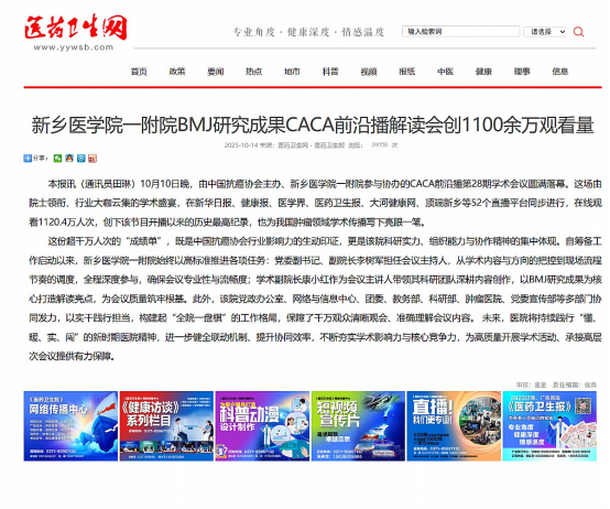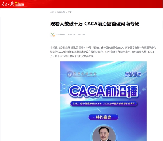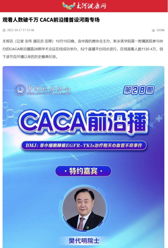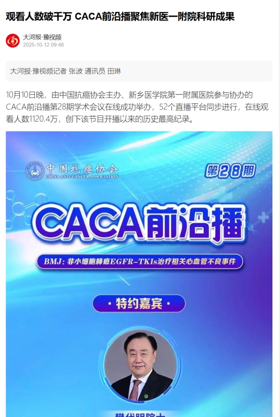 【人民日报、中国抗癌协会官微、医药卫生网、大河报】等媒体报道CACA前沿播聚焦我校第一附属医院科研成果 观看人数破千万