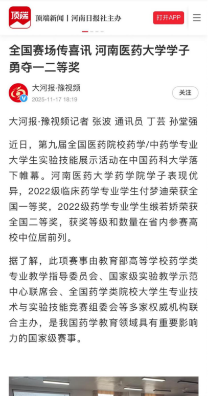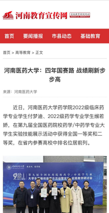 近日,第九届全国医药院校药学/中药学专业大学生实验技能展示活动在中国药科大学落下帷幕。我校药学院学子表现优异,2022级临床药学专业学生付梦迪荣获全国一等奖,2022级药学专业学生缑若娇荣获全国二等奖,获奖等级和数量在省内参赛高校中位居前列。多家媒体报道。