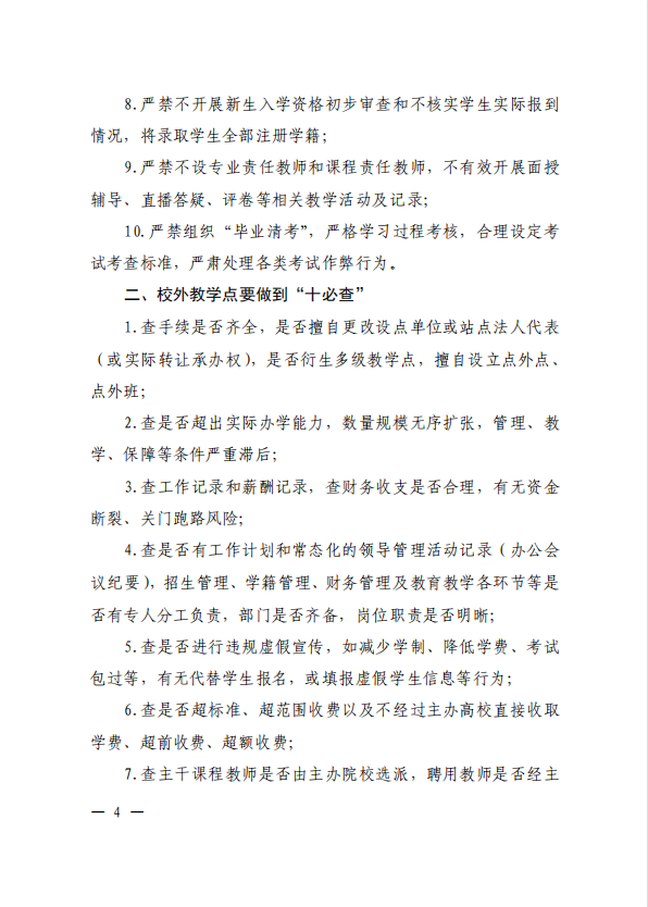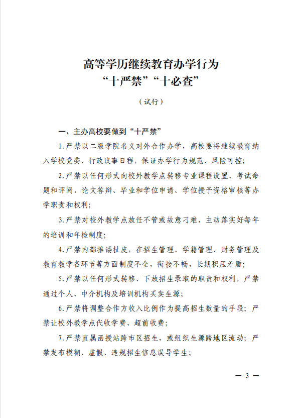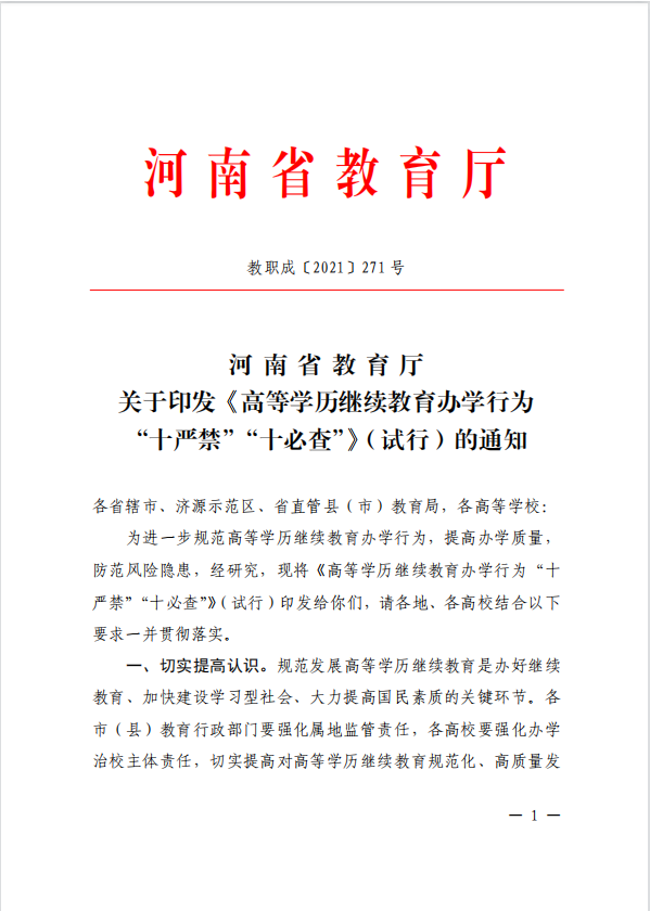 河南省教育厅关于印发《高等学历继续教育办学行为“十严禁”“十必查”》(试行)的通知