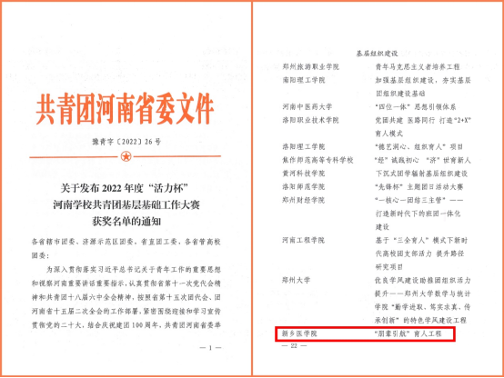 近日,共青团河南省委发布了《关于2022年度“活力杯”河南学校共青团基层基础工作大赛获奖名单的通知》(豫青字【2022】26号),我院“朋辈引航”育人工程荣获高校组基层组织建设模块三等奖。