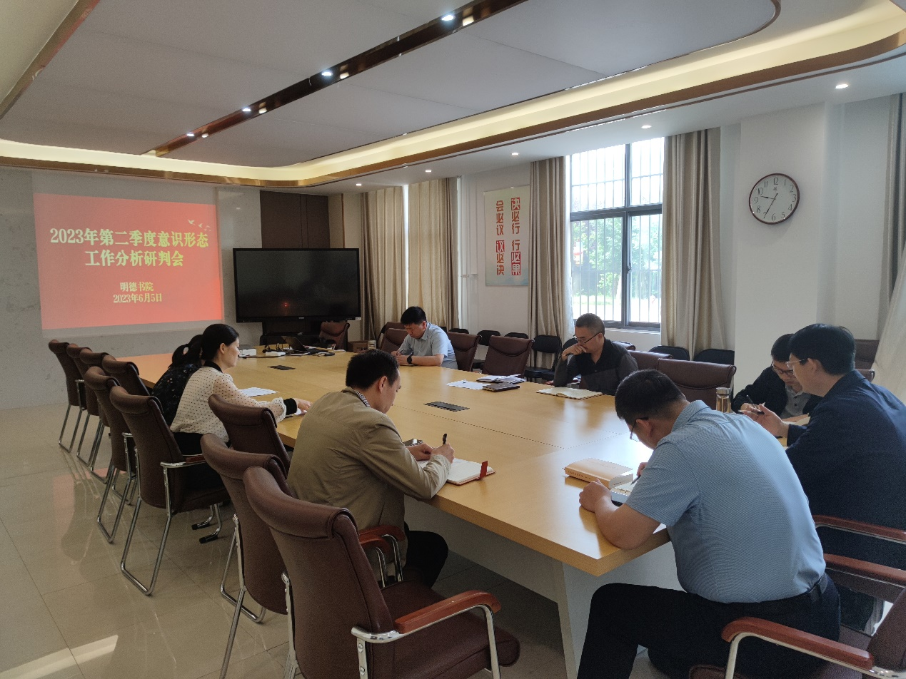 6月5日上午,明德书院在会议室召开2023年第二季度意识形态工作分析研判会,分析研判当前意识形态形势,安排部署下一步工作。院长邱永建以及书院党委委员、全体科级干部参加会议。会议由党委书记王正晓主持。