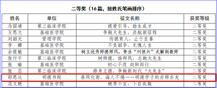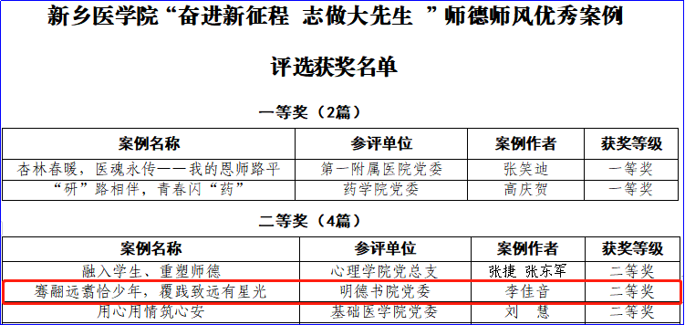 明德书院党委提交的案例《骞翮远翥恰少年,覆践致远有星光》获得师风优秀案例评选二等奖;邵思达撰写的文章《春风化雨,诲人不倦——明德学子的亦师亦友》获师德教育主题征文评选二等奖;李文妮撰写的文章《聚明德之力培师德师风——以书院制改革培育新征程上“大先生”》获师德教育主题征文评选三等奖。