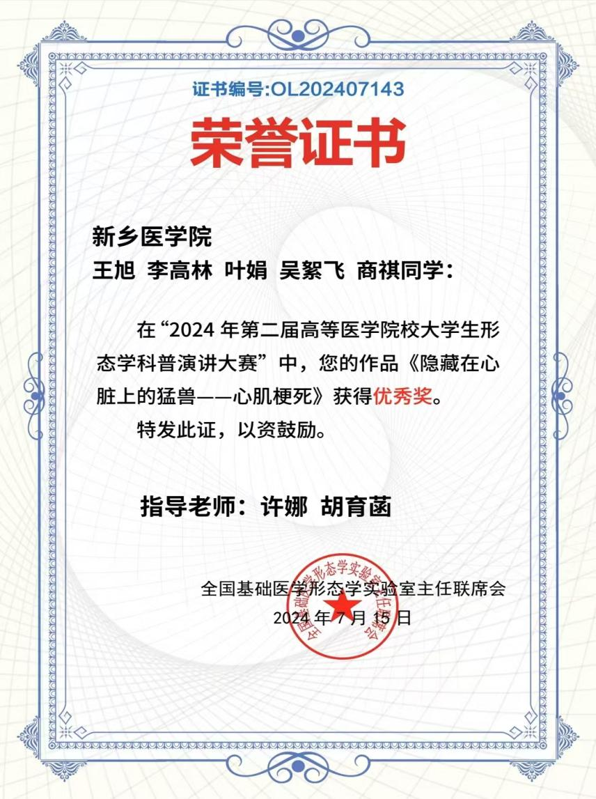 在近日举办的“第二届高等医学院校大学生形态科普演讲大赛”中,我院2021级麻醉七班学子李高林团队的作品《隐藏在心脏上的猛兽——心肌梗死》在学业导师许娜、胡育菡的指导下荣获优秀奖。