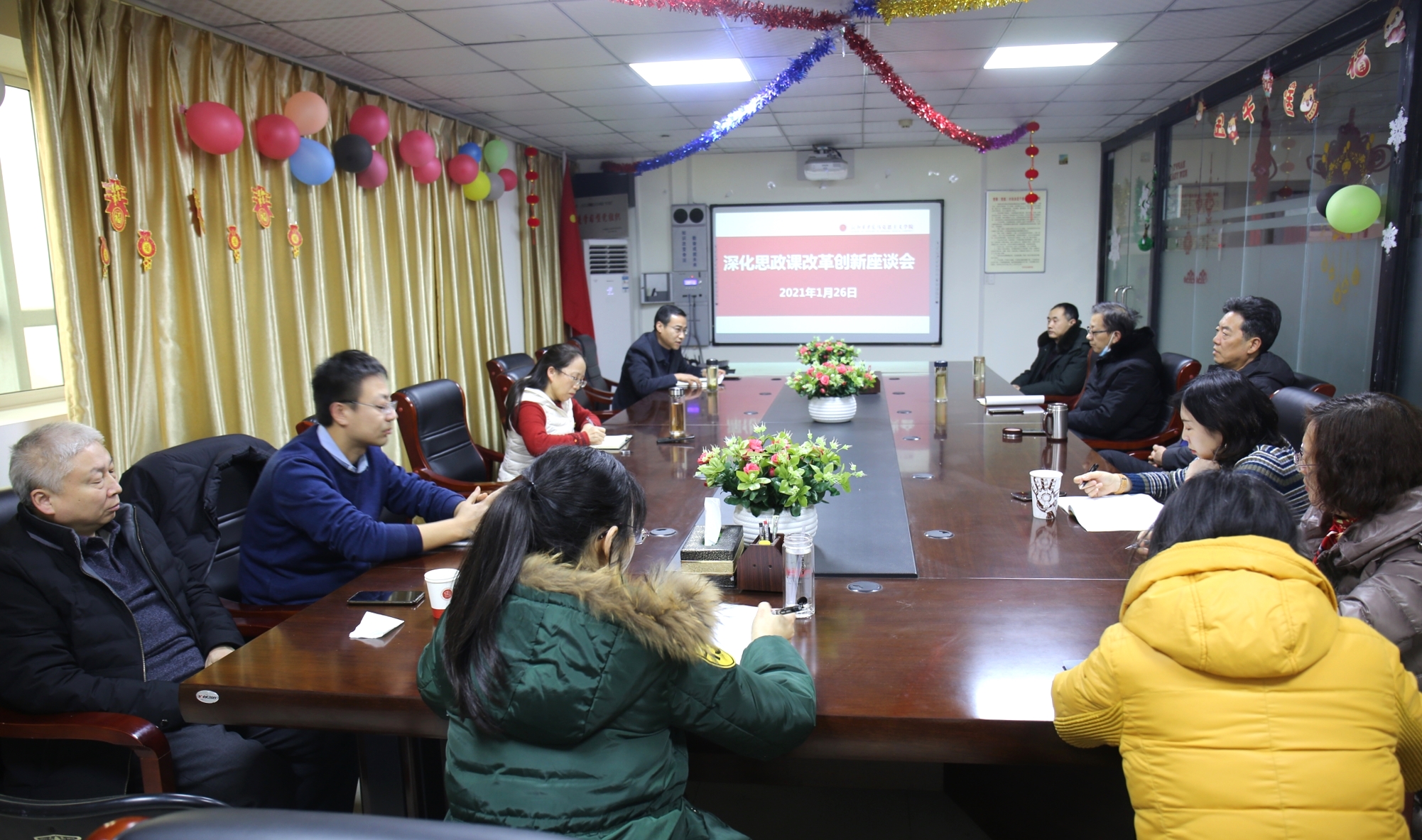 2021年1月26日下午,我院在西校区综合楼六楼会议室召开深化思政课改革创新座谈会,我院院长、副院长、督导委员会成员以及各科室主任参加会议,会议由副院长冯秋季主持。