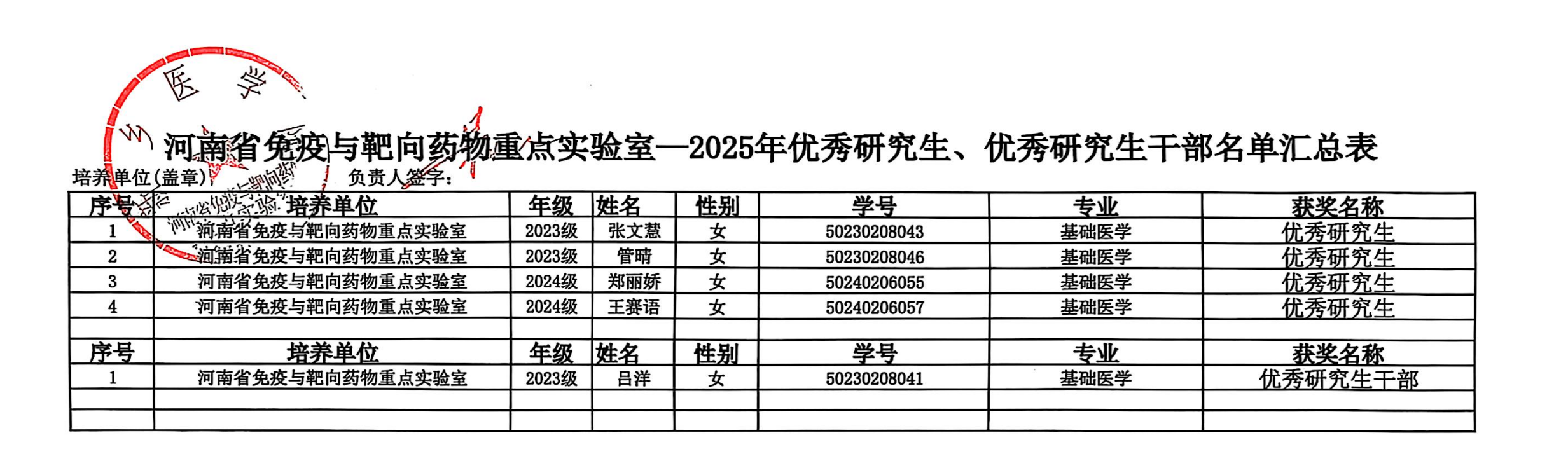 河南省免疫与靶向药物重点实验室2025年优秀研究生暨优秀研究生干部名单公示