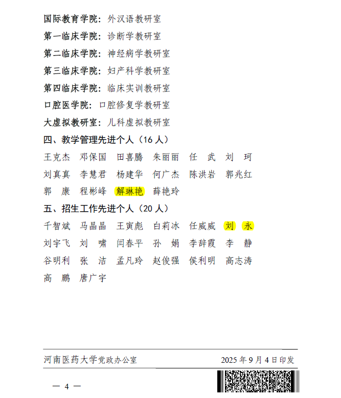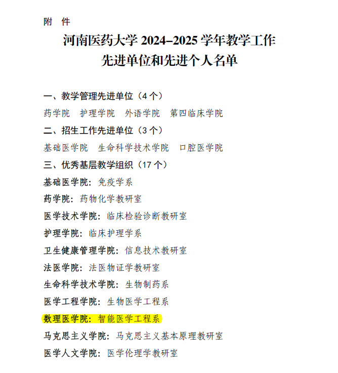 本网讯(图文/解琳艳)近日,学校公布了2024-2025学年教学工作先进单位和个人的表彰名单。智能医学工程系荣获“优秀基层教学组织”称号,充分体现了该系在教学工作中的卓越表现。同时,教学管理与专业建设办公室主任解琳艳被评为“教学管理先进个人”,表彰其在教学管理方面的突出贡献。此外,学院骨干教师刘永也因在招生工作中的优秀表现获评“招生工作先进个人”。此次表彰旨在激励更多教师和团队为学校的教学发展做出更大贡献。