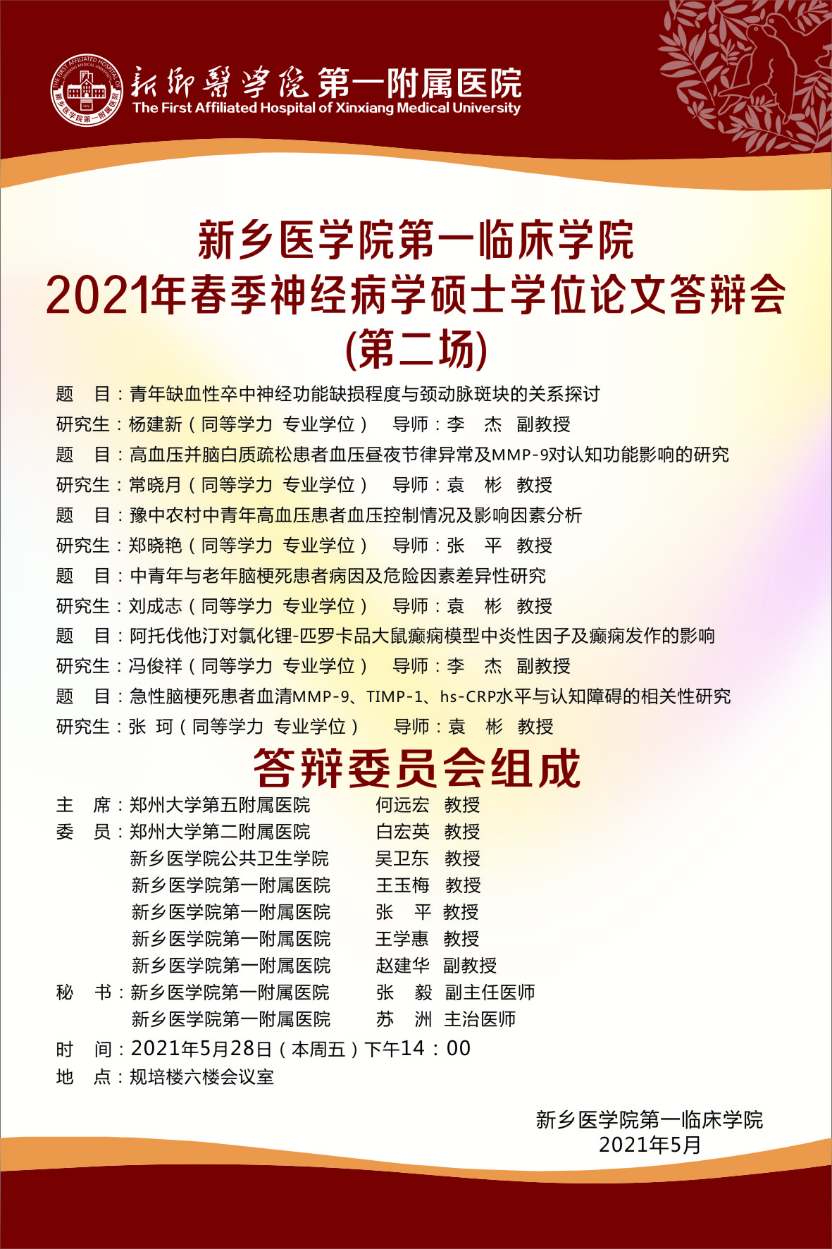 2021年上半年华亿在线体育(中国)官方网站第一临床学院神经病学硕士研究生答辩海报