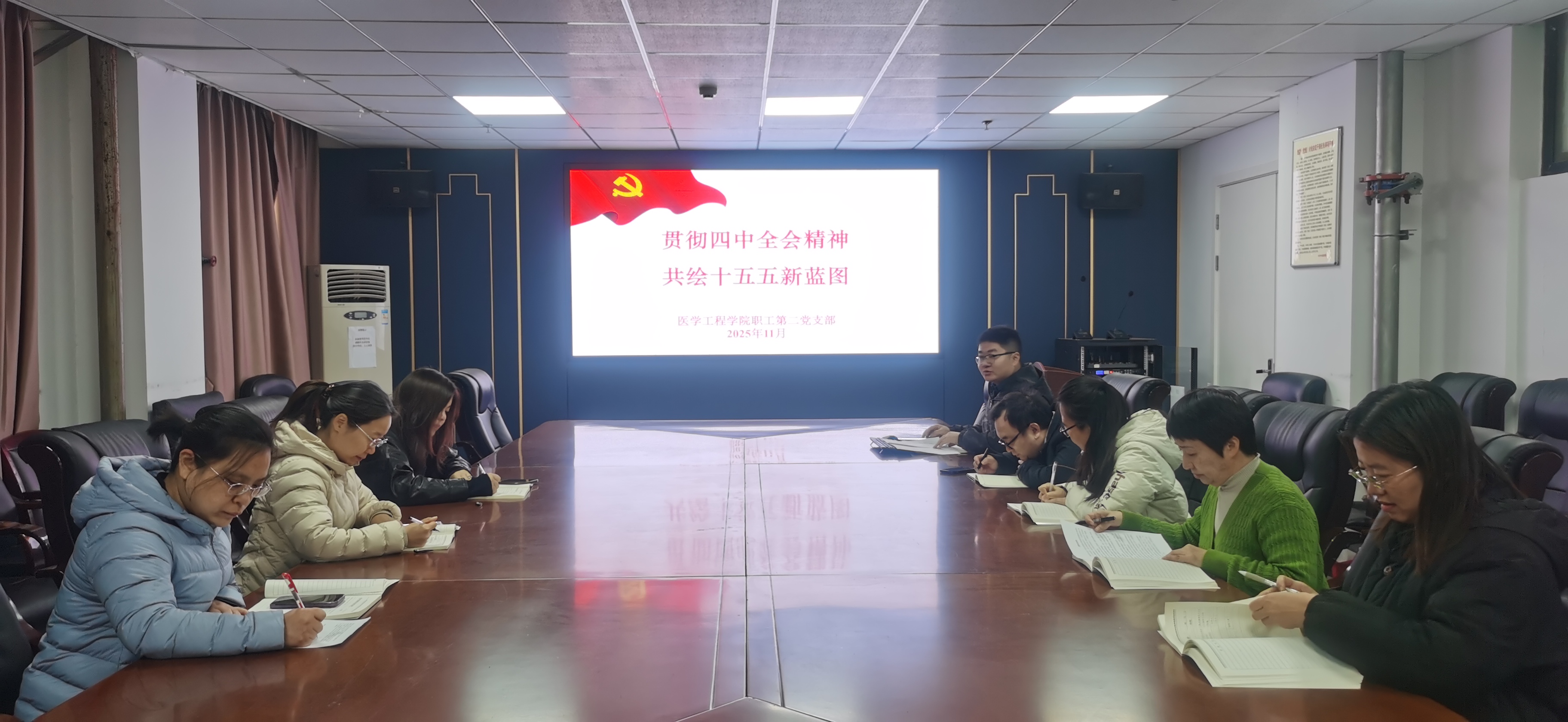 为深入学习贯彻党的二十届四中全会精神,精准把握“十五五”规划核心要义,凝聚全院党员奋进力量,11月28日,我院职工第二党支部在科技楼716会议室开展“贯彻四中全会精神,共绘十五五新蓝图”主题党日活动。学院党员同志齐聚一堂,以理论学习赋能实践担当,为学院高质量发展注入思想动力。