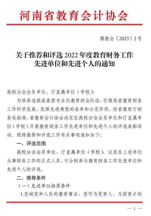 近日,河南省教育会计协会发布了2022年度教育财务工作先进单位和先进个人的评选结果,我校荣获“河南省2022年度教育财务工作先进单位”称号,4名同志荣获“河南省2022年度教育财务工作先进个人”。
