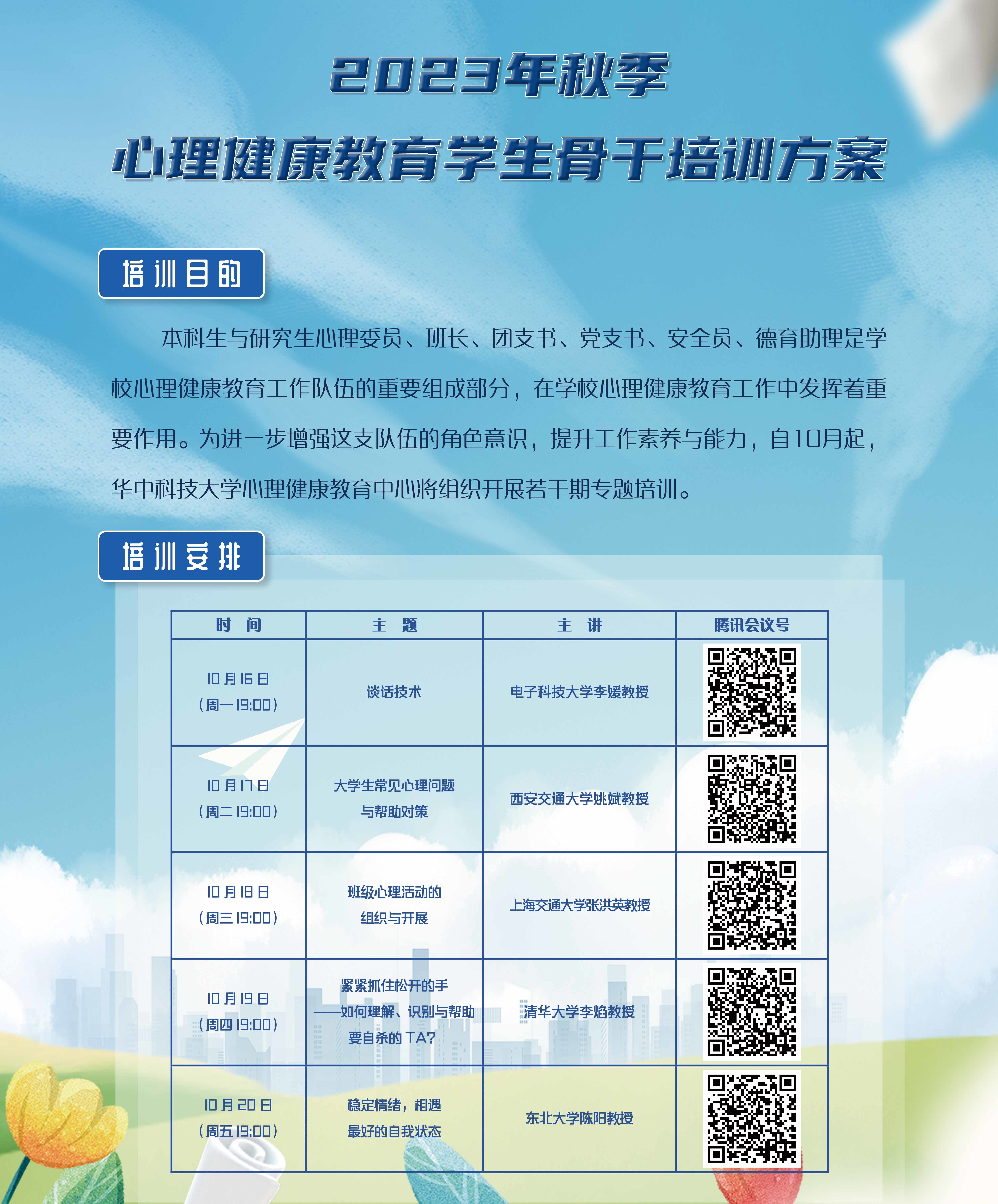 本科生与研究生心理委员、班长、团支书、党支书、安全员是学校心理健康教育工作队伍的重要组成部分,在学校心理健康教育工作中发挥着重要作用。为进一步增强这支队伍的角色意识,提升工作素养与能力,华中科技大学心理健康教育中心特邀请知名专家开展系列专题培训,现就组织收看事宜通知如下