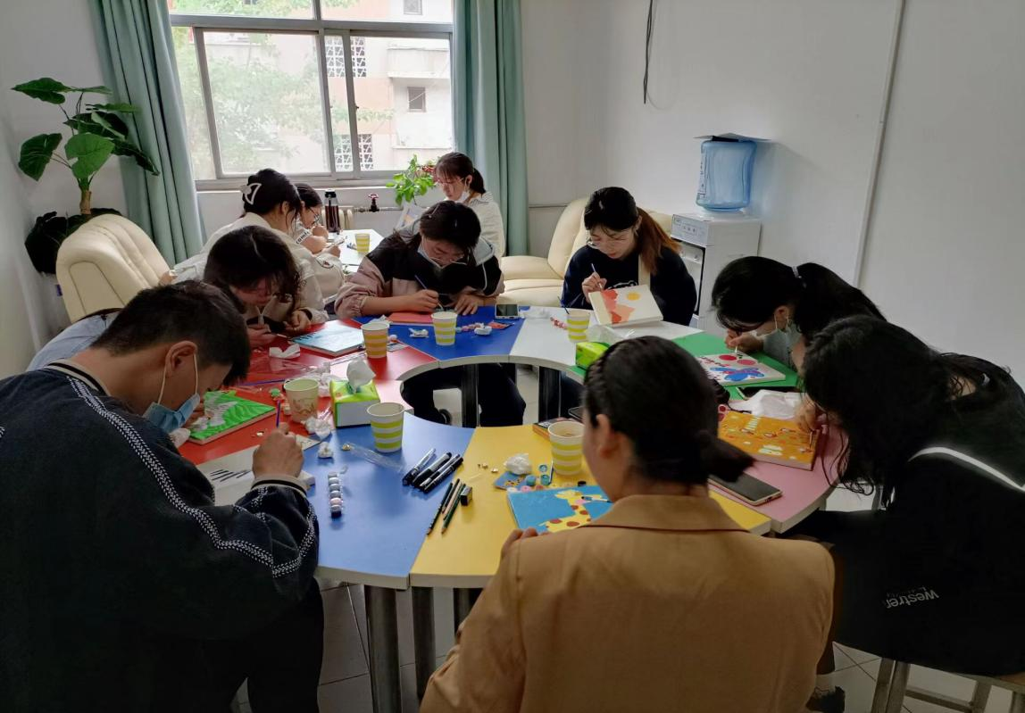 “创”——DIY手工创作。为让学生走出宿舍,发现校园美好事物,增进互动交流、体验美好心理慢时光,大学生心理健康教育指导中心在三个校区分别开展“巧手妙心”DIY手工团体系列活动,通过“用画笔表达心情--手绘帆布包”“信手‘粘’来、缓解压力--粘土DIY”“留住美好印记--干花相框画”和“平静心灵--数字油画”四种手工创作形式,让学生发现自己、悦纳自己,享受心理的平静。