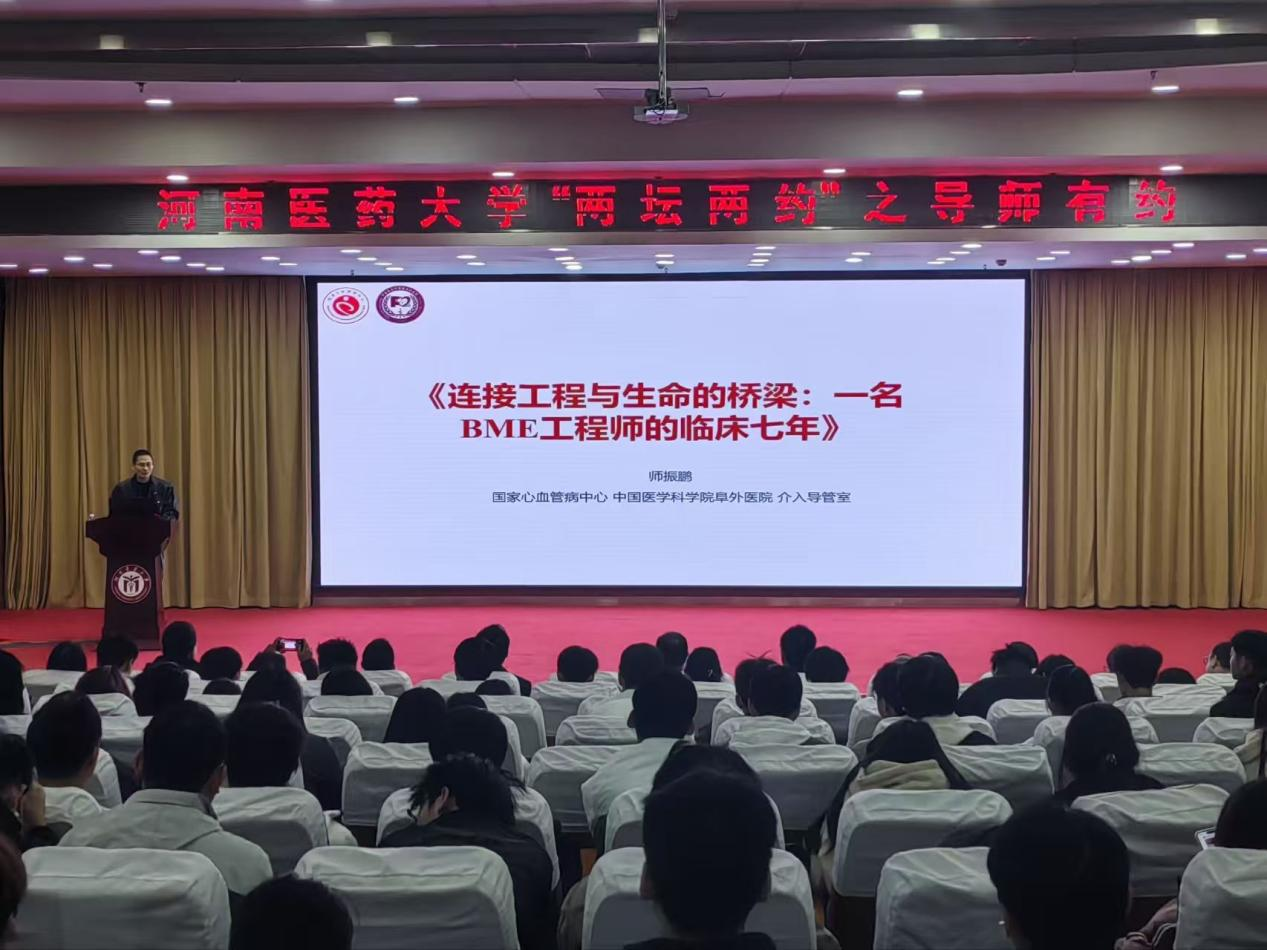 之后,师振鹏开始进行经验分享,他以“BME是工程与医学的桥梁”为核心,回顾从河南医药大学本科生物医学工程、北京航空航天大学生物力学深造,到中国医学科学院阜外医院的成长:从初期负责DSA、OCT等设备运维的“管理员”,到解读影像数据的“临床分析伙伴”,再到推动AI决策系统研发的“科研桥梁”。他重点介绍中国原创QFR技术,其历经三代迭代,解决传统诊疗痛点,使患者1年不良心血管事件率下降3%,获欧美认证并写入多国指南。他还梳理BME就业方向,强调“工程硬实力+医学软技能+创新思维”的重要性,建议学子深入临床、练好跨界沟通能力。最后,师振鹏鼓励学弟学妹们:“祝愿你们都能找到自己的战场,成为一名不可或缺的 ‘问题终结者’!”