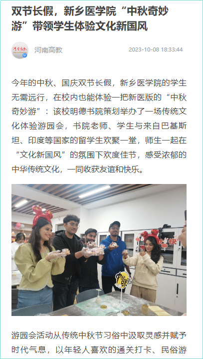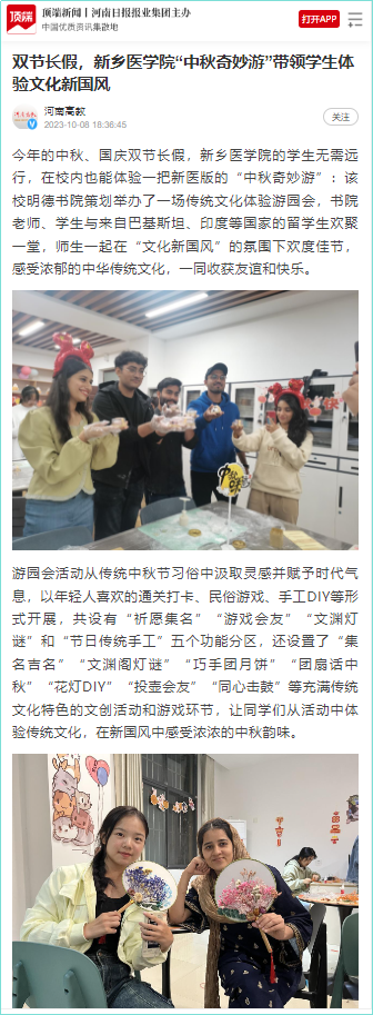 今年的中秋、国庆双节长假,留校过节的同学无需远行,在校内也能体验一把新医版“中秋奇妙游”:我校明德书院策划举办了一场传统文化体验游园会,书院老师、学生与来自巴基斯坦、印度等国家的留学生欢聚一堂,师生一起在“文化新国风”的氛围下欢度佳节,感受浓郁的中华传统文化,一同收获友谊和快乐。受到多家媒体报道。(供稿:李佳音)