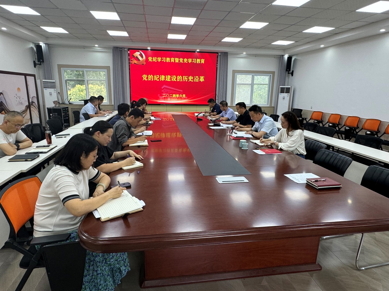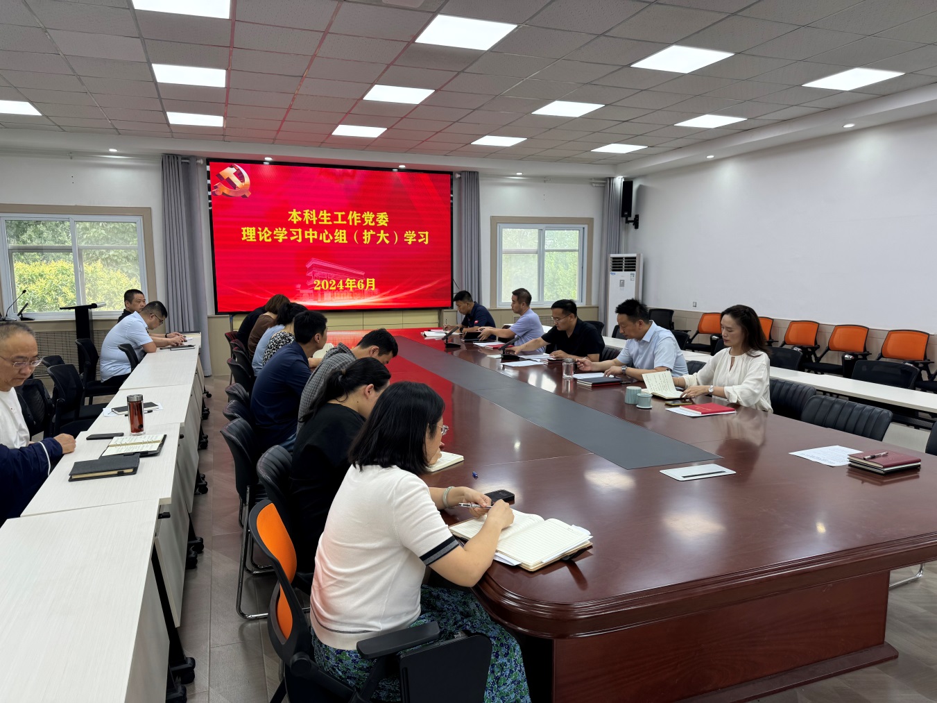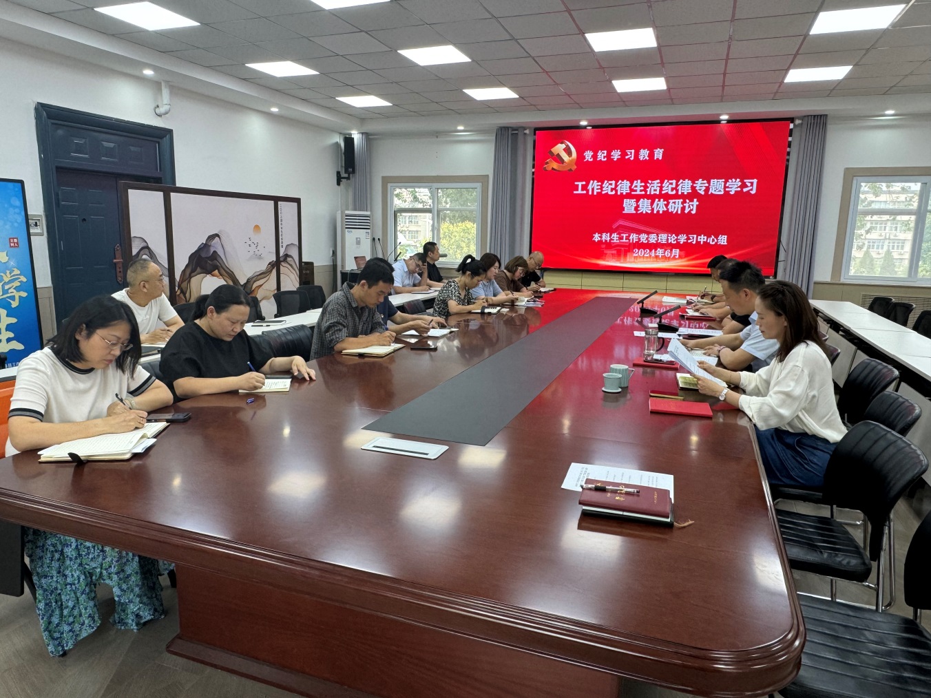 2024年6月14日下午,本科生工作党委理论学习中心组在南校区务实楼四楼会议室组织了本科生工作党委理论学习中心组(扩大)学习暨党纪学习教育集体研讨,本科生工作党委书记葛治国主持学习和集体研讨,党委理论学习中心组成员和本科生工作职工党支部全体党员、党委本科生工作部(本科生学院)全体教职工、第五临床学院辅导员参加学习。