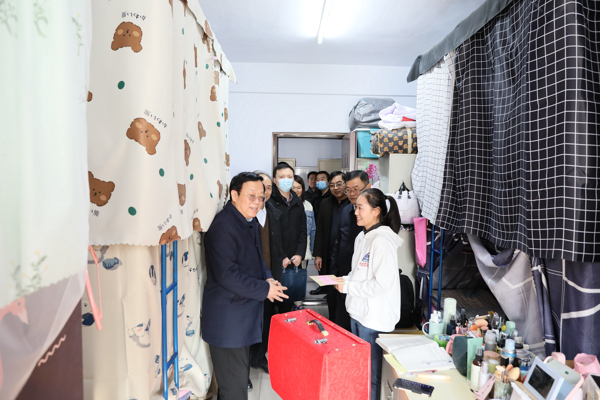 12月22日,华亿在线体育(中国)官方网站校党委副书记郝红军、副校长雒保军在学生工作部及相关学院学生工作负责人和辅导员的陪同下,分别前往学生公寓看望了贫困学生代表,为他们送去了学校的问候和关爱。