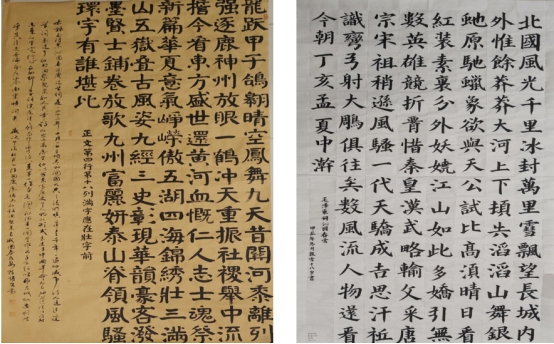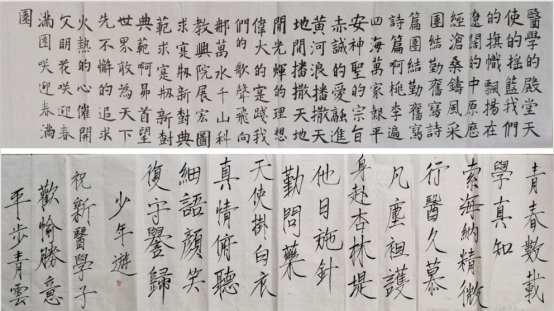 另有一些书法作品则呈现出灵动飘逸的特点。其线条恰似行云流水,于宣纸之上自由舒展,潇洒自如。笔画疏密得当,如音符在纸间跳跃,奏响一曲曲优雅的旋律,生动地映射出校园中那充满活力与创意的文化氛围。这些作品将校园生活里的灵动与多元以传统笔墨的形式呈现,或如青春的舞步轻盈欢快,或如思维的火花跳跃闪烁,让我们深切感受到中华优秀传统文化在青春活力的校园绽放出独特魅力与蓬勃生机。