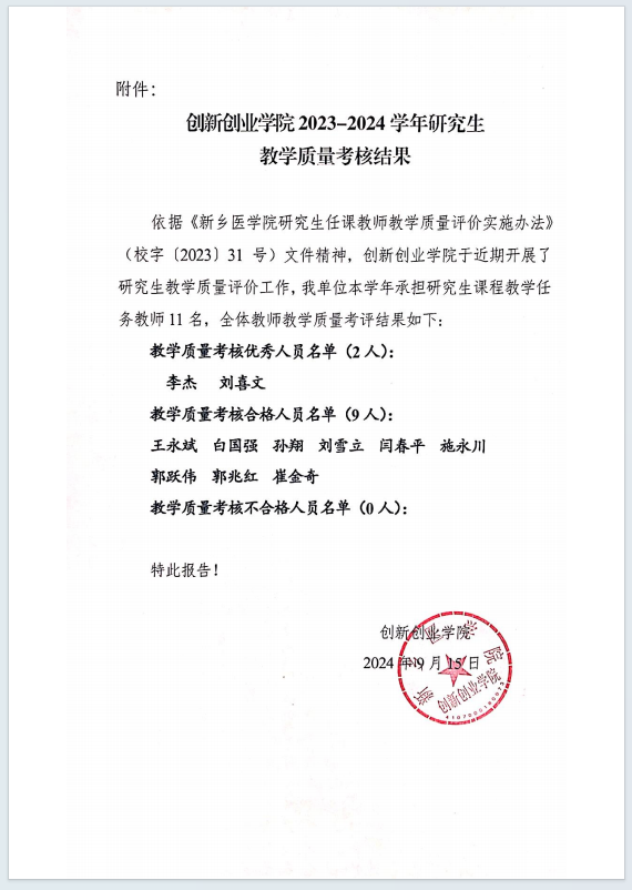 依据《华亿在线体育(中国)官方网站研究生任课教师教学质量评价实施办法》(校字〔2023〕31号)文件精神,创新创业学院于近期开展了研究生教学质量评价工作,我单位本学年承担研究生课程教学任务教师11名,全体教师教学质量考评结果予以公示: