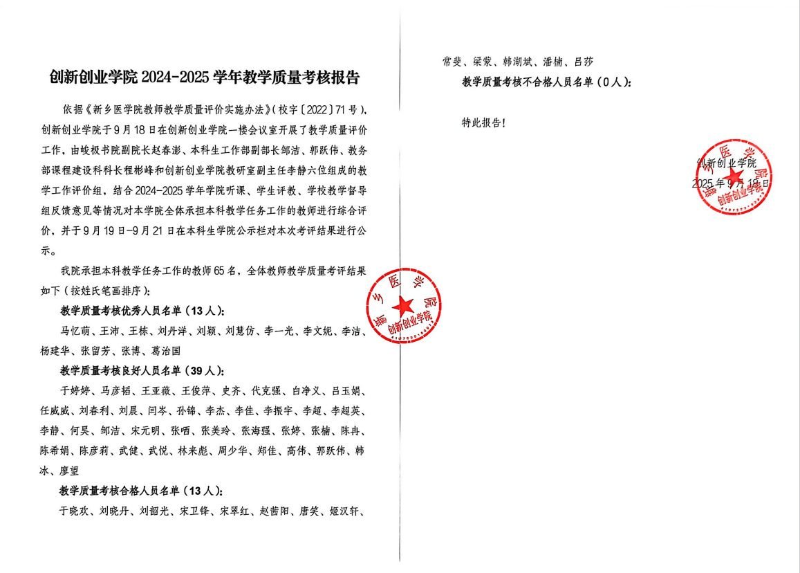 依据《华亿在线体育(中国)官方网站教师教学质量评价实施办法》(校字〔2022〕71号),结合2024-2025学年学院听课、学生评教、学校教学督导组反馈意见,创新创业学院于9月18日在创新创业学院一楼会议室开展了教学质量评价工作,对本学院全体承担本科教学任务工作的教师进行了综合评价。现将评价结果予以公示: