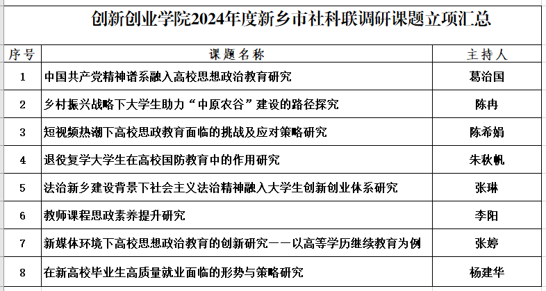新乡市社会科学联合会公布了新乡市社科联2024年度调研课题立项名单,我院《中国共产党人精神谱系融入高校思想政治教育研究》、《在新高校毕业生高质量就业面临的形势与策略研究》、《短视频热潮下高校思政教育面临的挑战及应对策略研究》等8个项目获批立项。
