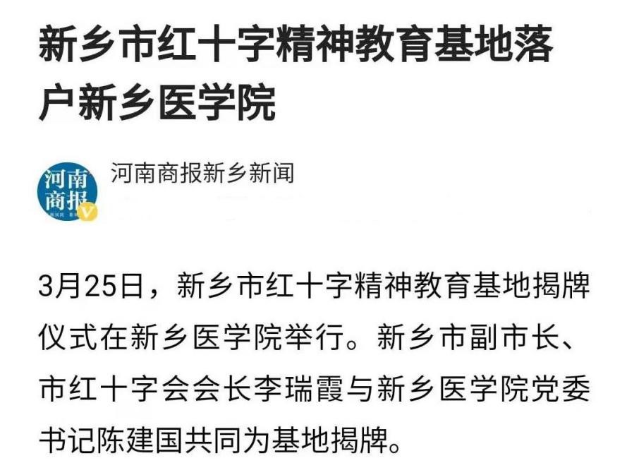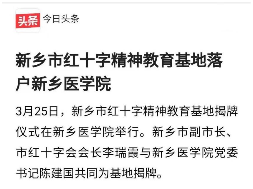 日前,新乡市红十字精神教育基地揭牌仪式在我校举行。新乡市副市长、市红十字会会长李瑞霞与校党委书记陈建国共同为基地揭牌。基地的建立既是对红十字精神在一代代新医人之间薪火相传的肯定,也是对培养学生树立正确人生观,提高社会责任感,厚植家国情怀的有力引导。
