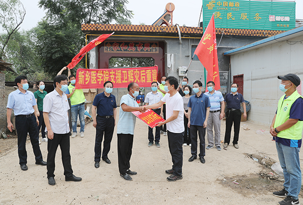 8月12日下午,校党委书记陈建国,党委副书记郝红军,党委委员、副校长朱武凌,党委委员、工会主席邵金远带领相关单位负责同志,将校领导和广大教职工爱心捐赠的23万余元及8000余件衣物、被褥等物资送到了结对帮扶的卫辉市西沿村,支援西沿村灾后重建。