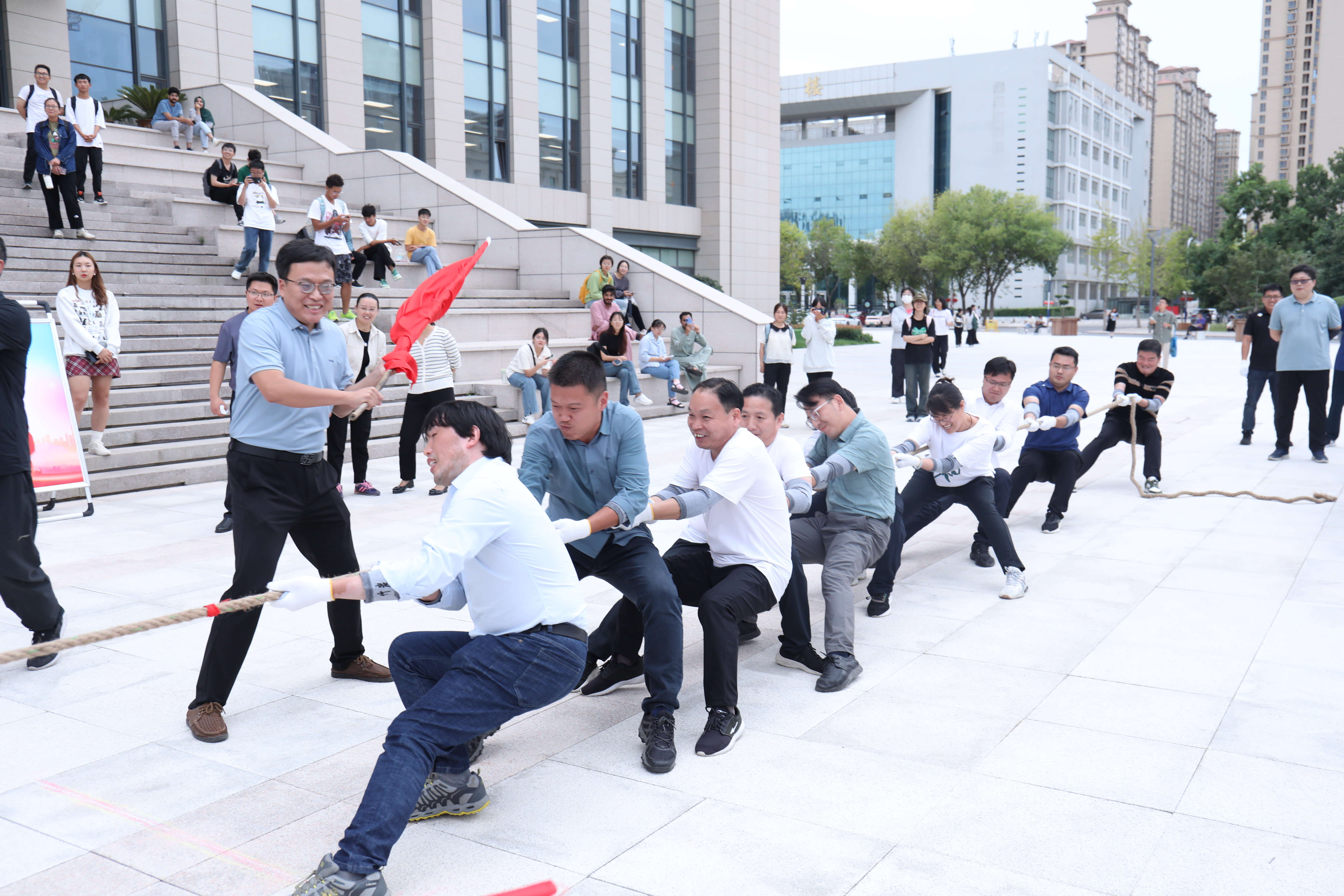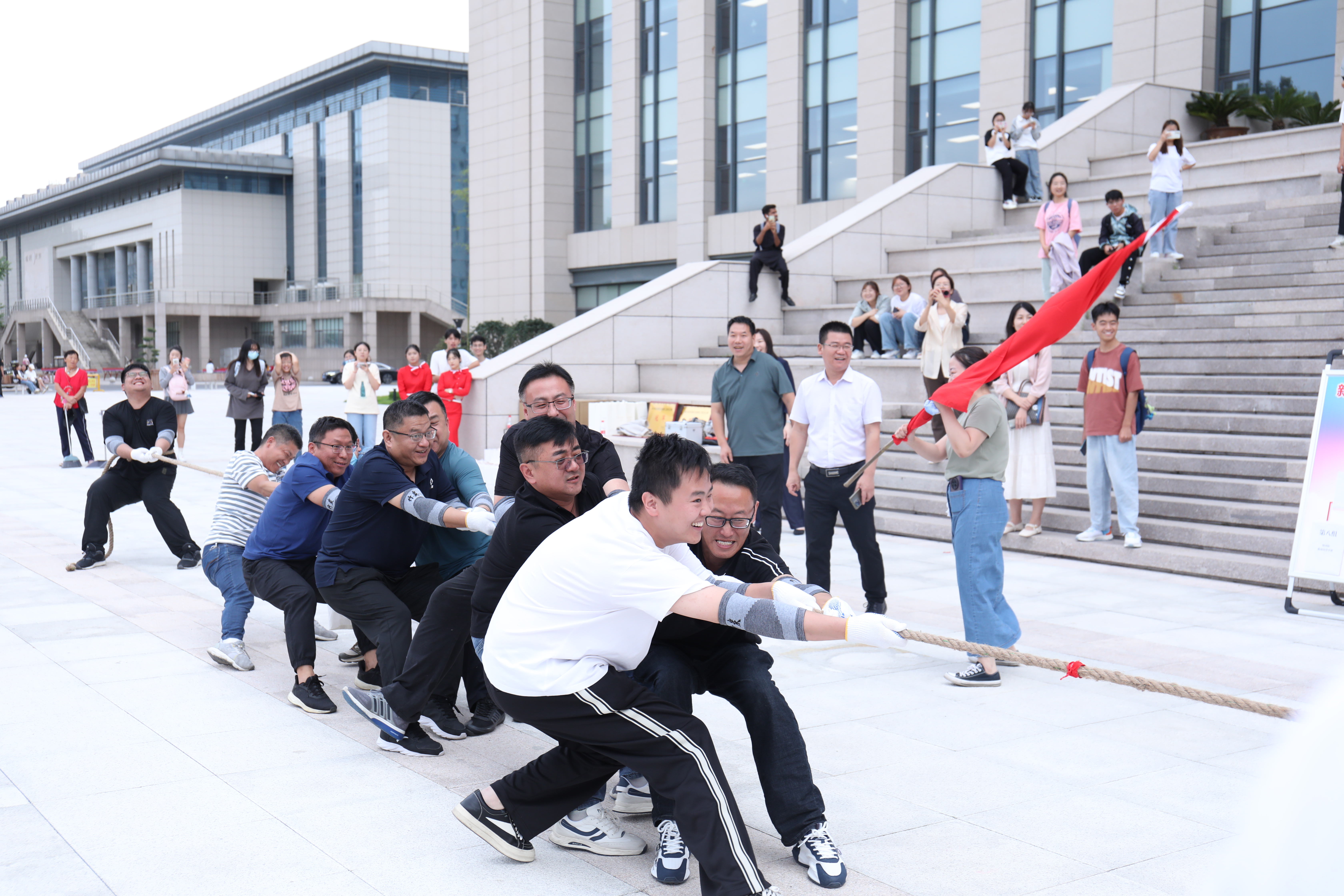 此次比赛共有八支队伍参赛,每队12人,其中领队1名,监督员1名,参赛选手10名。比赛实行淘汰制晋级方式,各小组抽签决定比赛顺序。当比赛的哨声响起,每支代表队都显示出最强的比赛阵容,大家默契配合、齐心协力,一起高呼着“一二,一二”的号子声,双手紧握长绳,憋足了劲拼命往后拉;未参赛人员自发组成啦啦队在队伍旁边助阵加油,恨不得抓起绳子一起努力。号子声、呐喊声,此起彼伏,飘荡在整个广场上空。经过激烈的角逐,由教务部、发展规划部组成的第五组参赛队获得冠军;由党委组织部、保卫处、国有资产管理处组成的第二组参赛队获得亚军;由审计事务部、党政办公室、党委统战部、科技发展部组成的第一组参赛队和后勤组成的第七组参赛队获得季军;其他四组参赛队获得纪念奖。