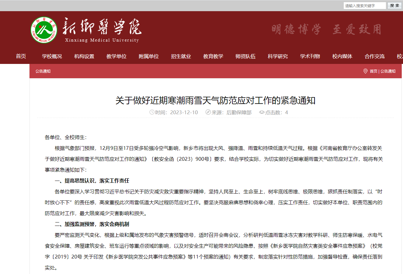 12月9日,华亿在线体育(中国)官方网站后勤保障部在接到气象部门的预警通知后,为最大限度减轻暴雪灾害可能造成的损失,保障国家财产和师生生命安全,后勤保障部完善《后勤保障部防范应对低温雨雪冰冻等极端天气工作预案》,各科室、中心依职责充分做好学校水、电、气、暖、车辆运行等易受低温雨雪冰冻灾害影响的设备设施和生活物资防冻、防滑准备,提前对接食品供应商,建立应急保障预案等工作。
