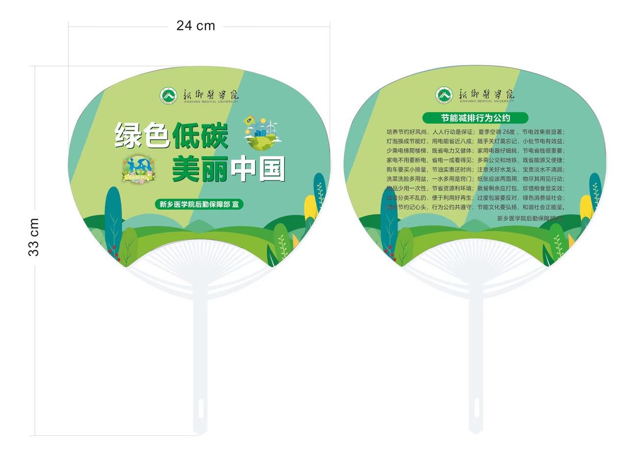 为了给炎炎夏日送去一抹清凉,学校后勤选择定制“扇子”作为宣传方式,“扇子”正面印制字样“绿色低碳、美丽中国”,背面印制“节能减排行为公约”,尺寸24×33cm。