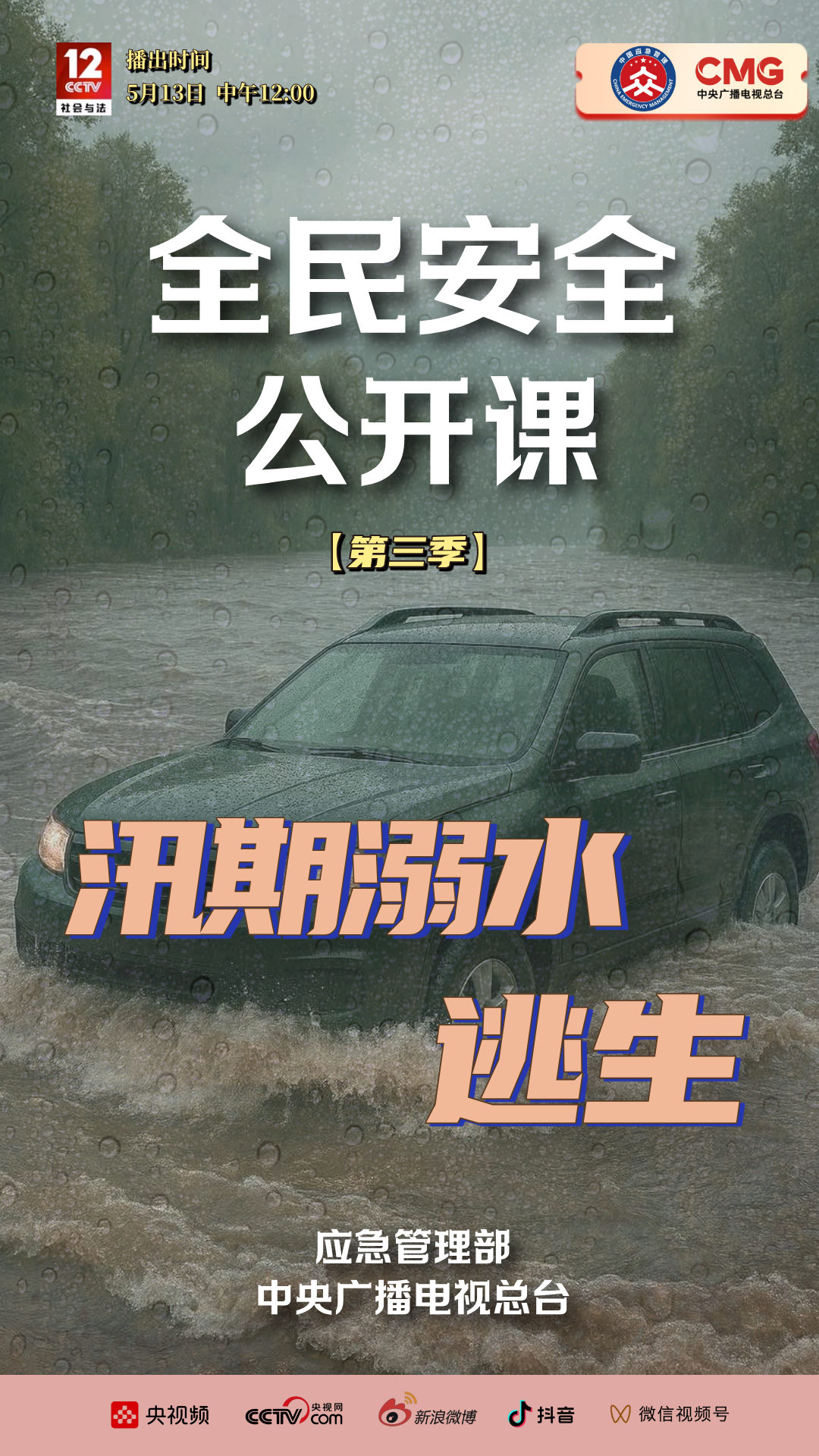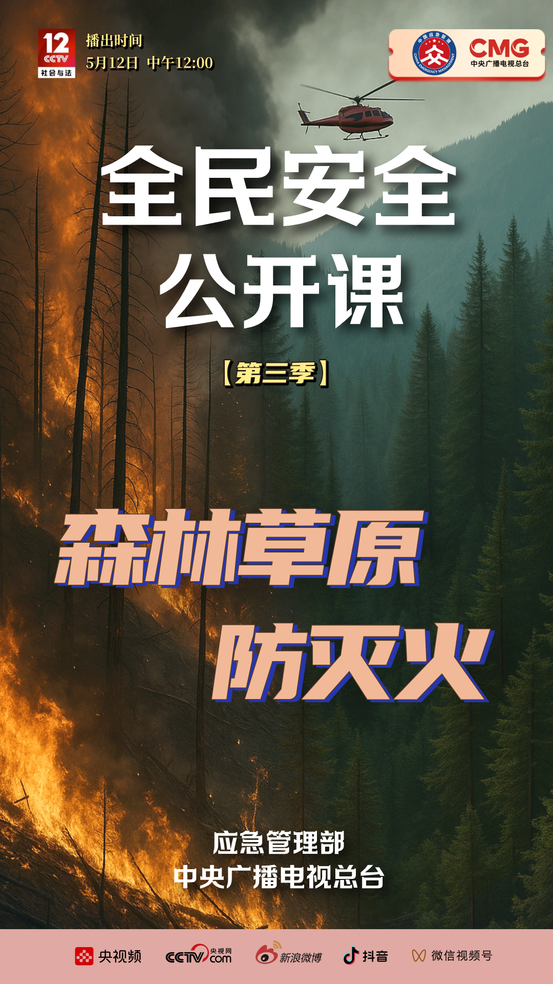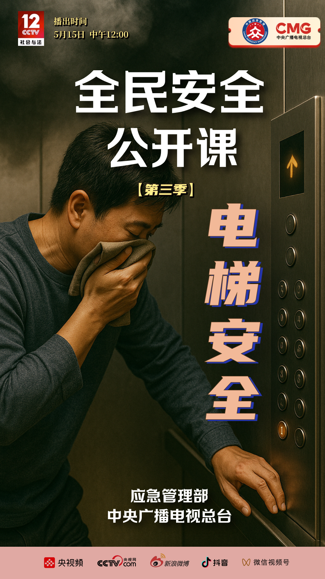 应急管理部与中央广播电视总台联合制作《全民安全公开课》第三季系列节目,将于5月12日至16日每天午间12:00在央视社会与法频道CCTV -12《生命线》栏目播出,该系列节目围绕汛期防溺水、森林草原防灭火、高楼火灾逃生、电梯安全、地铁公交安全五大主题,带领观众走进广西、天津等地,应急科普教育基地火灾纪念馆消防研究所等场所,针对性普及应急安全知识和避险自救技能,推动实现"人人讲安全、个个会应急"。