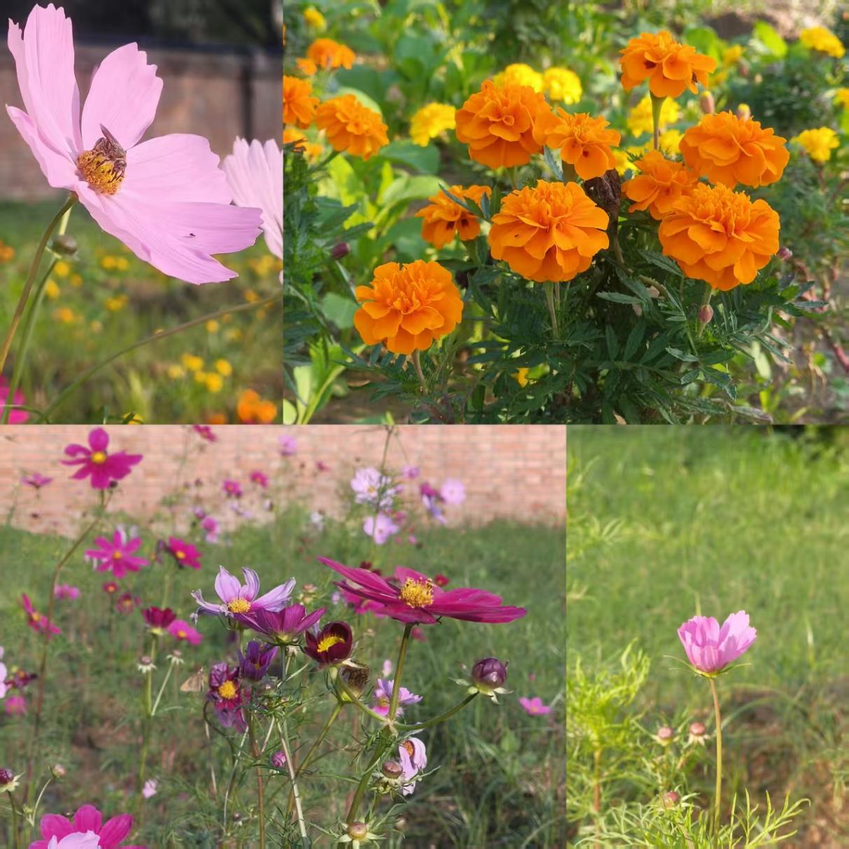 眼下,河南医药大学泊月湖东侧的苗池迎来最美时节——此前“播撒希望 耕耘成长”劳动教育活动栽种的百日菊、万寿菊竞相绽放,橙黄、玫红、明黄的花朵连片成景,成为校园里一道亮眼的生态风景线,这背后离不开后勤保障部持续的精细养护与师生的共同守护。