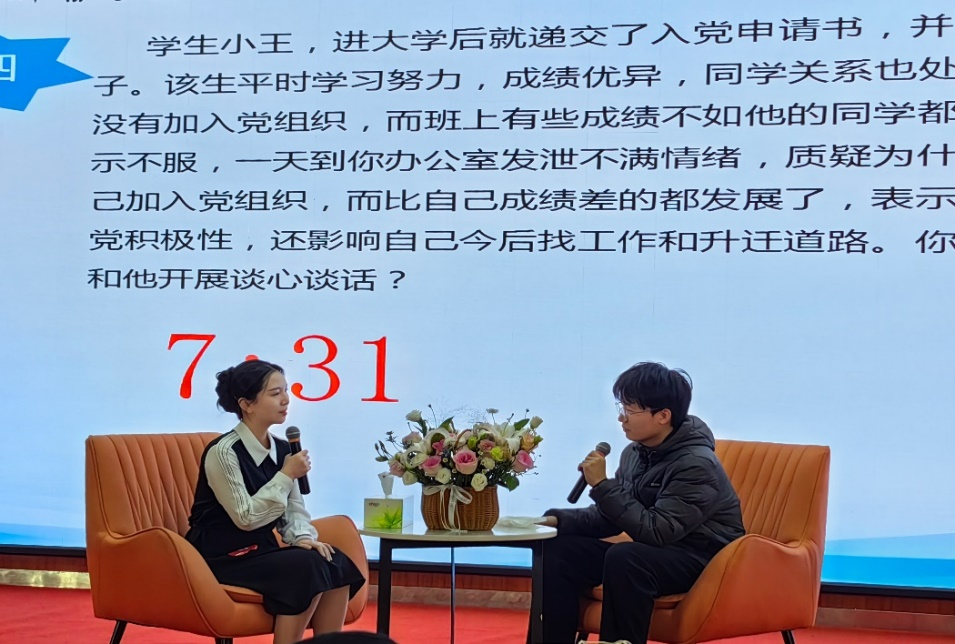 此次大赛是对辅导员综合素质的一次全面考察,比赛共设有理论考试、案例研讨、谈心谈话三个环节,涵盖了辅导员的专业知识、教育教学能力、心理咨询技巧等多方面素质。在理论考试环节中,我院辅导员姜明君凭借扎实的专业知识和理论基础,展现出了高水平的理论素养。在案例研讨环节中,充分展现了对班级情况的深入了解和对学生需求的精准把握。在谈心谈话分析环节,姜明君老师凭借丰富的工作经验精准地剖析问题,准确把握谈话核心,贴近学生思想实际,提出了切实可行的解决方案,面对“问题”学生既做到了价值引领的深度,又做到了关心关爱的温度,充分展示了积极向上的精神面貌和良好的职业素养,给评委和观众留下了较好的印象。