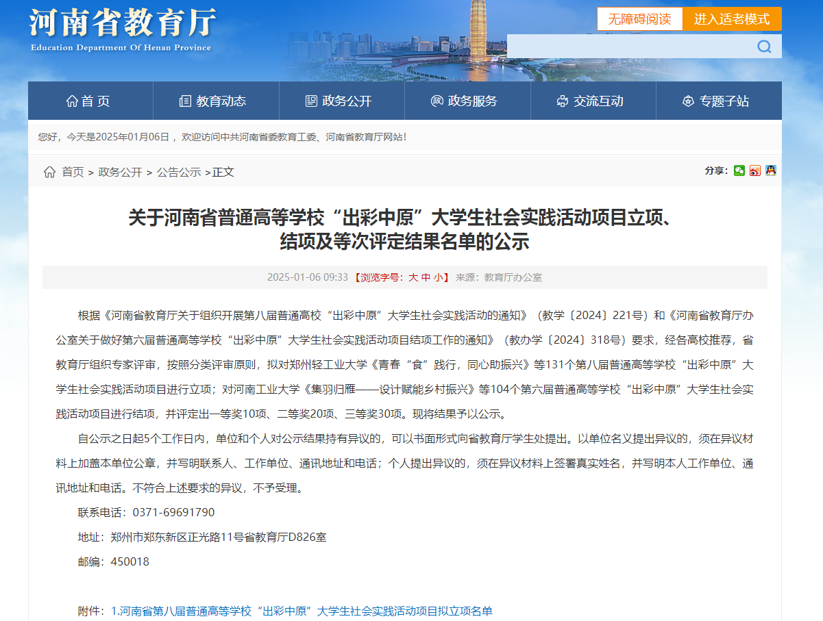 近日,河南省教育厅公布了《关于河南省普通高等学校“出彩中原”大学生社会实践活动项目立项、结项及等次评定结果名单的公示》,我院申报的《国情脚印——中原大地的革命回响》项目获批立项。