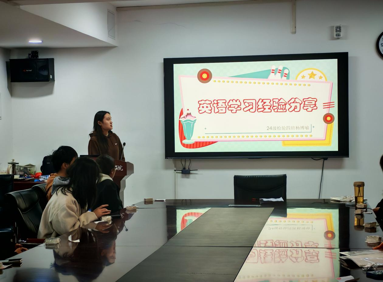 活动开篇,趣味单词接龙小游戏率先暖场。同学们积极响应、接龙流畅,会议室里欢声笑语不断,瞬间点燃现场氛围,为后续分享筑牢轻松互动的基础。在四六级备考分享环节,拥有外研社杯参赛经历的杨博喻同学,精准直击单词记忆难、阅读速度慢、写作与听力薄弱等备考核心痛点,毫无保留地分享了个人定制化备考时间规划与实用解题技巧。她特别强调高效利用优质网课资源的重要性,更着重提醒大家“备考心态至关重要”,为正处于焦虑中的备考学子注入了信心与前行动力。