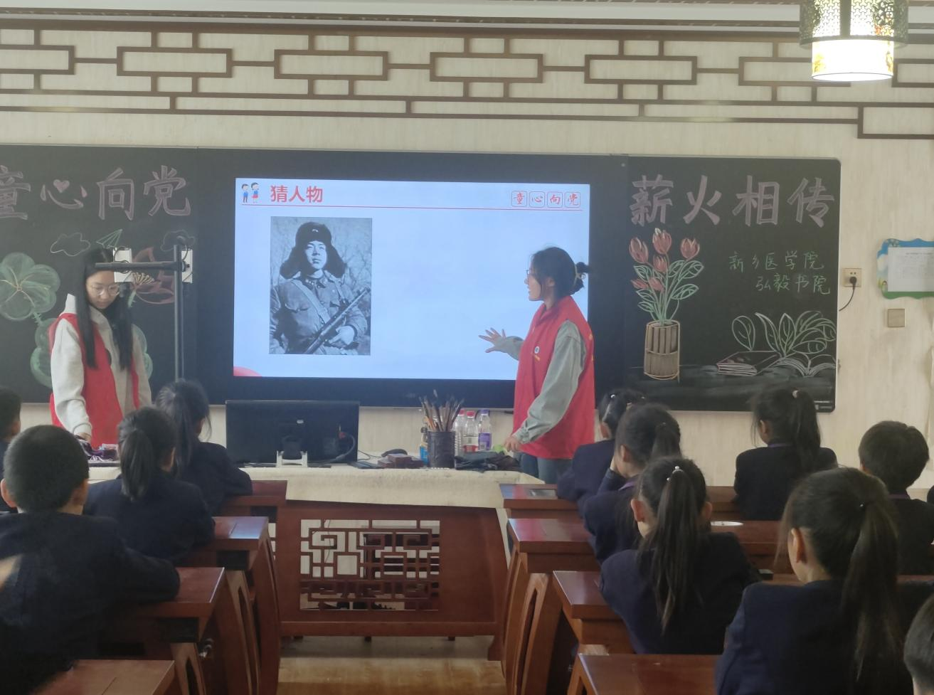 此次主题实践活动在新乡学院附属中学教室举行,分为讲解环节和游戏环节。讲解环节旨在帮助学生们更加深入的了解红色文化,以鲜明生动且耳熟能详的英雄事迹为例,传播红色精神;游戏环节则是以提问的形式进行,旨在增加学生们的现场参与度,加深对英雄人物和英雄事迹的革命印象。
