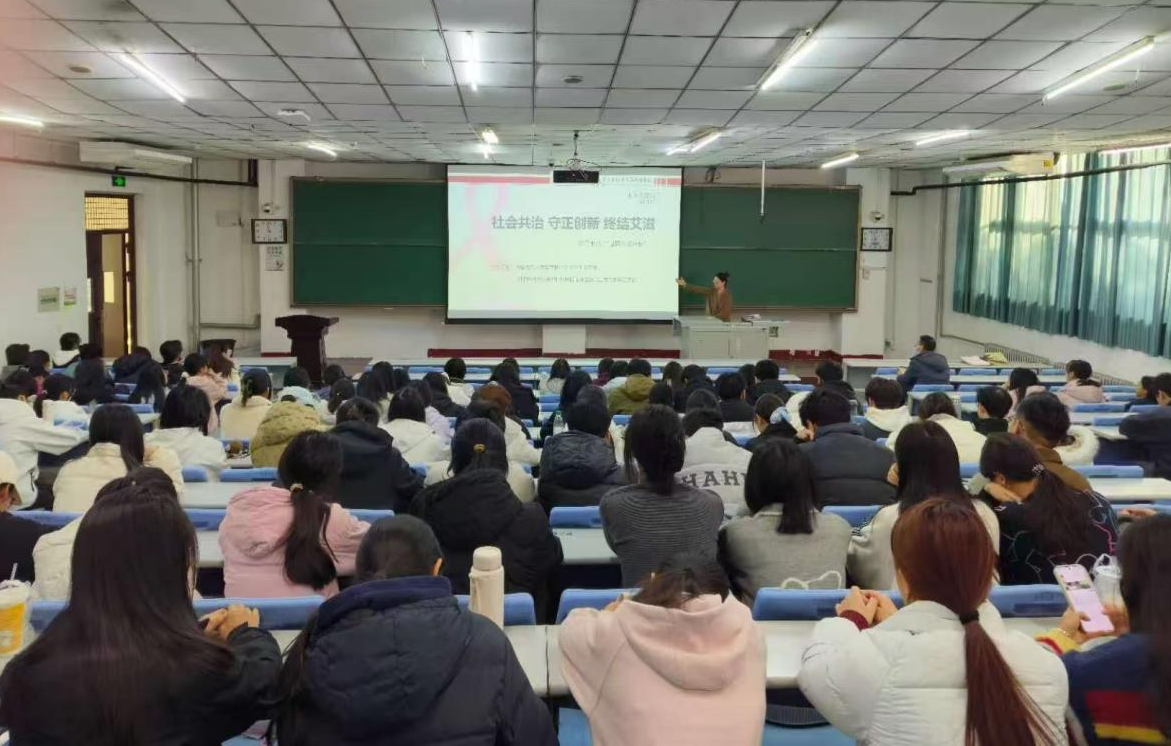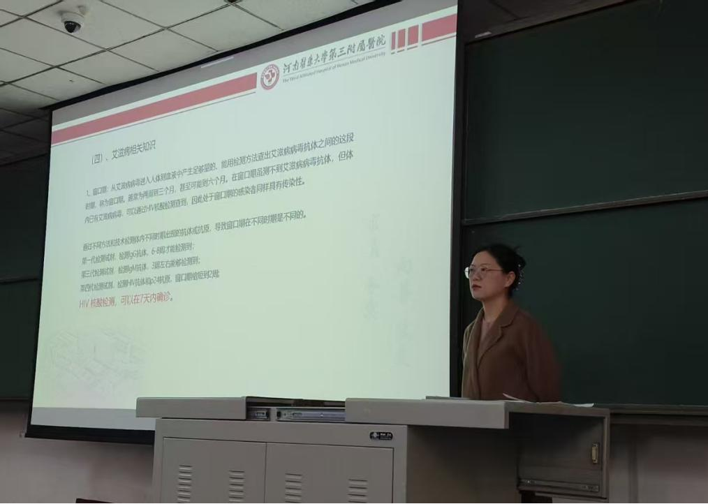 讲座特邀三附院艾滋病防治科老师刘燕子主讲,为两院学子带来专业权威的防艾知识科普。讲座中,刘老师结合最新流行病学数据,深入剖析了当前艾滋病疫情整体态势及青年学生群体面临的感染风险,用通俗化语言解读了艾滋病的主要传播途径,重点澄清了“日常接触传染”等常见认知误区。随后,她系统讲解了艾滋病病毒的传播扩散机制与科学防治措施,并通过播放真实案例宣传视频,直观呈现艾滋病暴露后预防的黄金时间与关键流程,引导同学们树立“科学认知、主动防护”的健康观念。现场学子专注聆听、认真记录,主动交流疑问,形成了浓厚的研学氛围。