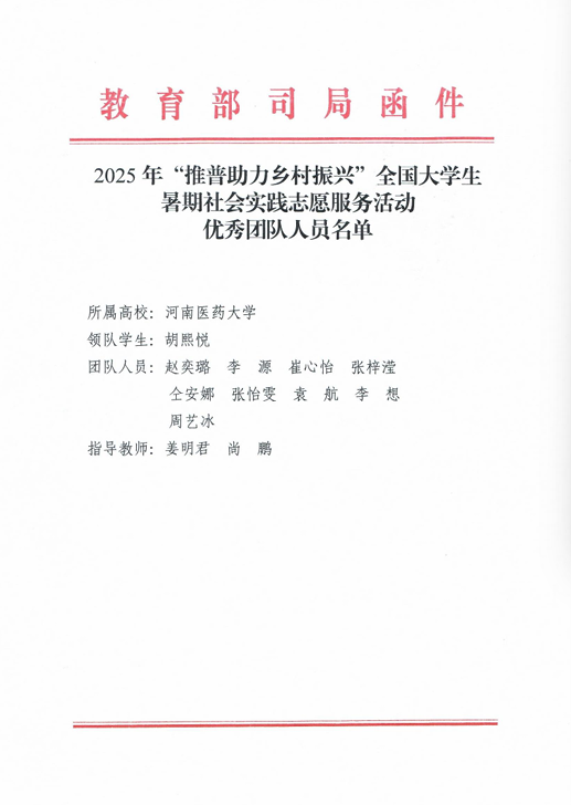 近日,由教育部语言文字应用管理司、共青团中央青年发展部联合开展的2025年“推普助力乡村振兴”全国大学生暑期社会实践志愿服务活动评选结果揭晓,我院与医学技术学院共同指导的“‘乡’约新声,‘语’你同行”实践团队从全国1680所高校的8013支团队中脱颖而出,获评全国优秀团队,教育部语言文字应用管理司和共青团中央青年发展部来信表扬。