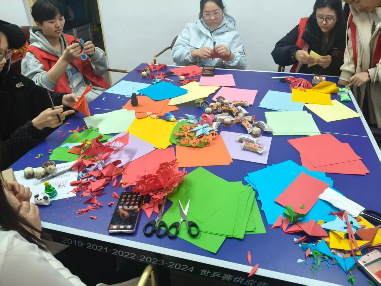 在“指尖生花·剪暖冬”剪纸体验区,工作人员提前准备好彩纸和剪刀,同学们围坐在一起一步步操作。从折叠红纸到勾勒线条,再到裁剪成型,大家都做得十分认真。不一会儿,一个个剪纸作品就完成了,同学们拿着自己的作品,脸上满是成就感。